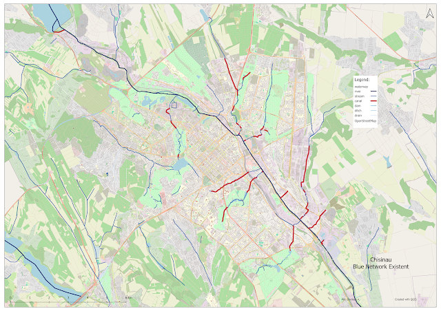 Harta prezintă Rețeaua Albastră a Chișinăului — un sistem de cursuri de apă, râuri și canale care au format istoric echilibrul hidrologic al orașului. Liniile roșii de pe hartă indică segmentele căilor navigabile care au fost canalizate sau introduse în conducte subterane. Aceasta este o practică comună în urbanism, mai ales în trecut, când arterele de apă erau considerate un obstacol pentru dezvoltarea urbană, iar bazinele de apă deschise — surse de insalubritate.