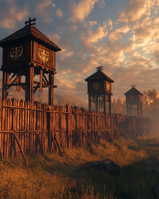 Один из ключевых элементов укрепленных поселений — башни, возведенные вдоль стен. Они использовались как для защиты, так и для наблюдения. Их деревянная конструкция позволяла быстро строить и поддерживать оборонительные линии, а высокий обзор предоставлял защитникам стратегическое преимущество.